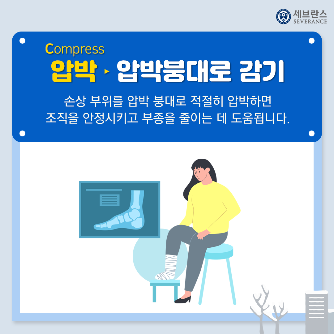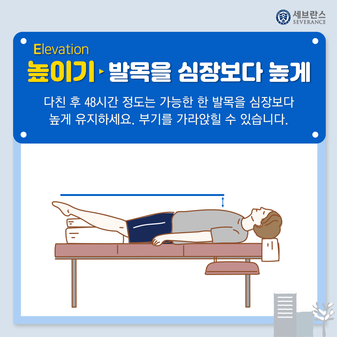 발목을 다쳤을 땐 첫 24시간 동안의 응급처치가 중요합니다. 발목 손상 시, RICE(Rest= 휴식, Ice=얼음찜질, Compression=압박, Elevation= 거상)를 기억하세요!