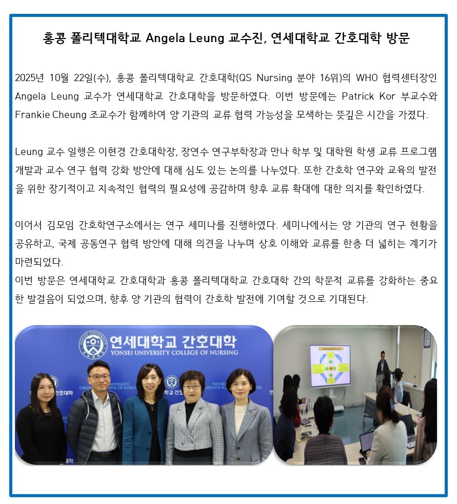 News 홍콩 폴리텍대학교 Angela Leung 교수진, 연세대학교 간호대학 방문 관리자 2025-10-23 조회수 240 공유하기 공유하기 페이스북 네이버블로그 카카오톡 카카오스토리 닫기 목록 이전글연세대학교 김모임간호학연구소, '2025 연세건강이음' 노인돌봄생활지원사 역량 강화 교육 성료 다음글2025년도 World's Top 2% Scientists 선정